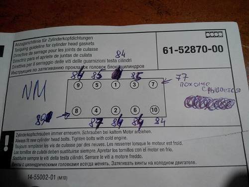 Для замены, по совету ALEX-72, была куплена прокладка ГБЦ VICTOR REINZ 61-52870-00 от 4A-FE мотора. Болты решено было оставить мои. Для затяжки болтов я использовал свой динамометрический ключ со шкалой и стрелкой и для его перепроверки взял профессиональный щелчковый ключ (хотя уже не один мотор зажимал своим ключом, но тут решил его перепроверить  ) Заходя вперёд скажу что разница между двумя ключами составила приблизительно в 2 Nm, что считаю несущественной. Приступил к затяжке болтов. Крутил достаточно медленно. Вобщем в несколько подходов, согласно схемы затяжки, довёл усилие до 29 Nm. Пометил спец.маркером все болты, проведя на шляпке в районе 12 часов полосу. Потом, опять же в несколько подходов, повернул их на 90 градусов. Усилие наростало без провалов. Когда подходил к 90 градусам, усилие на моём ключе показывало 60Nm/ Следующим проходом довернул все болты ещё приблизительно на 40-45 градусов. Усилие на всех составляло приблизительно 70 Nm. Последним проходом завершил доворот на необходимые вторые 90 градусов. Потом измерил усилие на всех болтах, результаты которых выкладываю на фото ниже. Болт № 7 (согласно схемы ) дошёл до 80 Nm и усилие начало плавно падать. Решил выбрать лучший болт из имеющихся с прошлой замены, фото которых я выкладывал немного раньше. Но это практически ничего не изменило и окончательно его я зажал последним. В итоге усилие на нём остановилось в районе 77Nm, что относительно всех остальных является самым маленьким Вот на такой вопросительной ноте и закончился сегодняшний рабочий процесс. Вот теперь и думаю, что благодаря толстой графитной прокладке выдержит ли вся эта тема или, всё-так и с блоком беда. P.S. Не считая этого одного болта показания усилия перед откручиванием приблизительно совпадают с полученными после затяжки. Добавлено спустя 7 минут 33 секунды:Вот, собственно, и все основные и ответственные моменты этого ремонта. Что думаете по этому поводу,клубни? Ездить так? Менять блок? Есть ещё вариант снять с этого болта шайбу, ещё на 2 витка больше будет резьбы. Но учитывая ещё одно раскручивание-закручивание всё это может сыграть злую шутку.