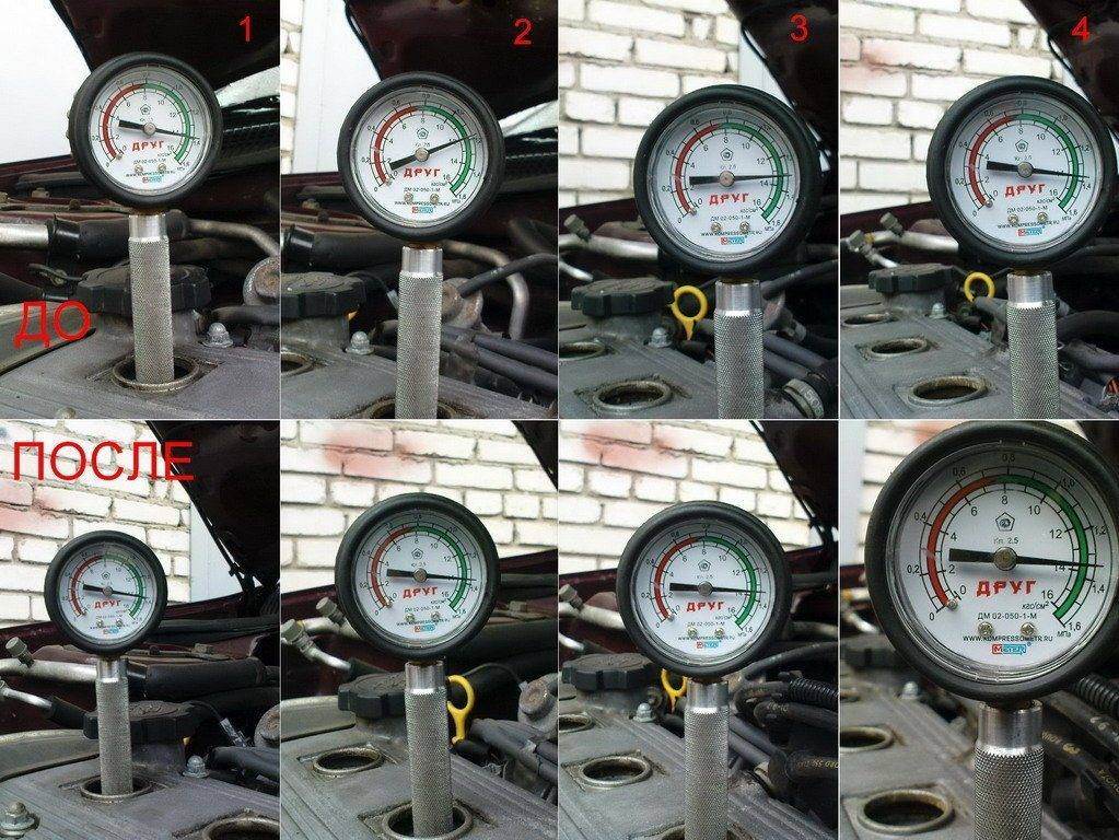 Vitek писал(а): Попробовал это зелье на своём движке. Вроде как работает. По-крайней мере, первый результат положительный. Компрессия подровнялась (до "операции" второй и третий цилиндры "прихрамывали"  ). После заливки продержал жидкость в цилиндрах около трёх часов. Если сразу после заливки жижу было видно через свечные отверстия, то после истечения указанного времени, вывернув свечи, жидкости не увидел. Опустил в цилиндр до поршня ЗИЛовский толкатель клапана, - вынул сухим!  Жижка за 3 часа вся стекла вниз, в поддон (попутно, как я надеюсь, отмачивая кольца  ). Сразу заменил масло (попахивало растворителем). За сутки пройдено около 100 км. Повторный замер компрессии - вместе с первым на фото. По-поводу масложора ничего не скажу, слишком мало времени и пробега. Компрессию мерил сам, без помощника, для чего под сектор дроссельной заслонки подсунул ключ (трубочка 10*12), зафиксировав её в открытом положении, и вместо реле стартёра вставил две отвёртки, перемыкая которые третьей, пускал стартёр. Да ещё предохранитель "EFI" вынул, дабы форсунки и бензонасос не включались. Всё описанное - на фото: