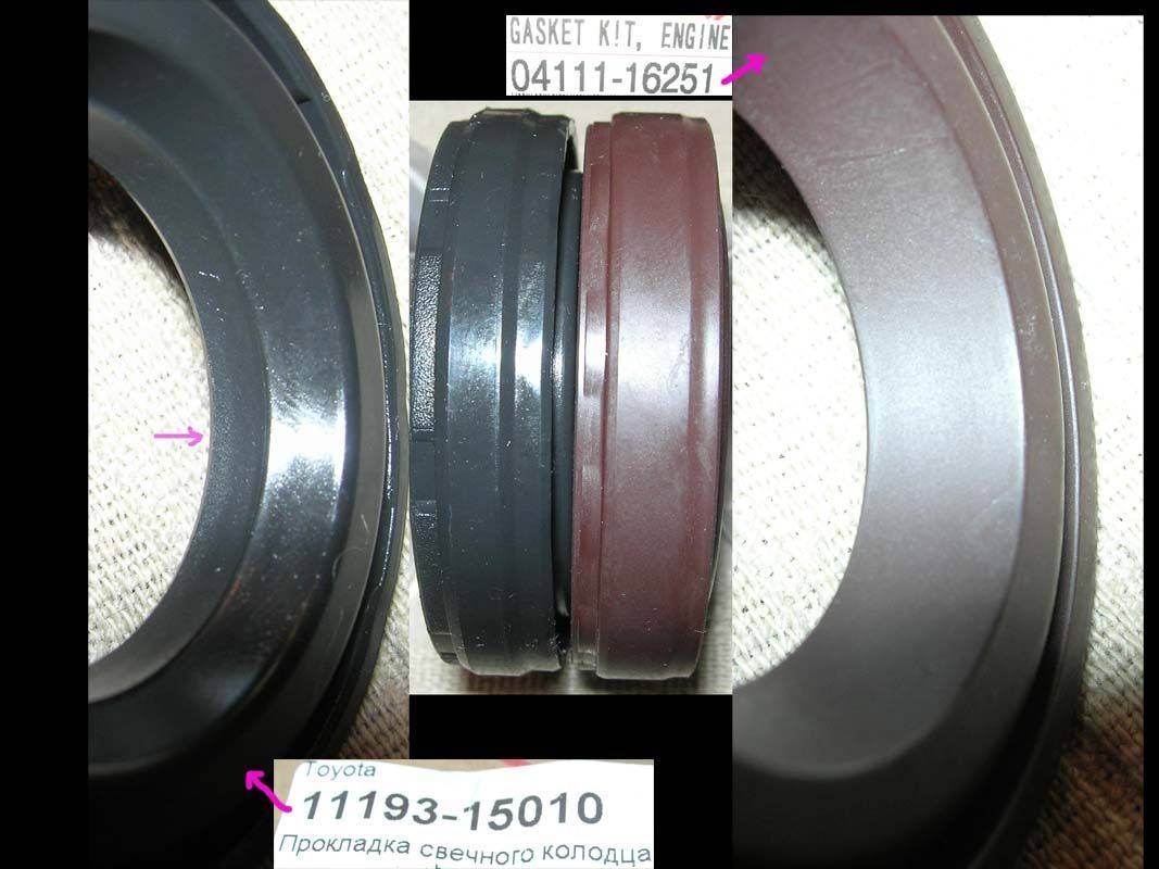 Получилось так, что по дурости я к полному комплекту прокладок для ремонта двигателя (Toyota 04111-16251) прикупил уплотнители свечных колодцев для Авенсиса (Toyota 11193-15010). Соответственно, сравнил. Фото в прикреплённых файлах. Разница в том, что от Авенисиса уплотнение идёт в виде цилиндрического пояска, а вот "родное" - острой кромкой (там конус). Попрошу ремонтников сравнить и если от Авенсиса подойдут - поставить. Там по наружному диаметру отличия некоторые в посадке всё же есть, но не думаю, что принципиальные.