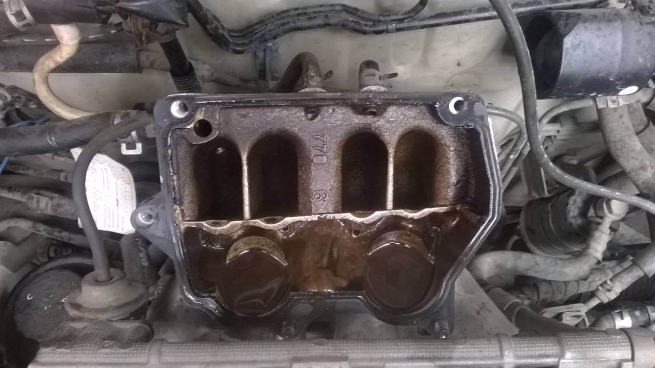 Двигатель иногда "клюёт" при разгоне, при этом загорается чек. Иногда троит. В холостую чек не горит и вроде всё в порядке. Клеммы диагностики перемыкал - показывает лямбду и датчик детонации. Потом начался жор антифриза и масла. Решил уже на следующей неделе ставить машину на ремонт, а сегодня почистить клапан холостого хода, ну и заодно на форсунки глянуть. Рампу удалось снять только после снятия крышки инжектора и вижу вот такую картину: