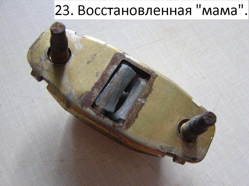 Папы у меня тоже оказались в отл. состоянии, видимо материал прочнее  , мамы (они по природе мягче) я разобрал: отогнув лепестки вытащил две резинки и два сухарика, почистил, зашкурил. Резинки оставил, а сухарики выточил из капролона по снятому образцу. На все двери 8 сухарей (одинаковых). Собрал мамки в обратном порядке. Установить на место очень просто и руки по локоть не надо засовывать. С торца в отверстие продеваем кусок мягкой проволоки, ловим ее в отверстии динамика, цепляем за ушко папы (одетого на маму до упора), направляя рукой, аккуратно вытягиваем проволоку, захватываем рукой и сажаем на место. Ушло дня два на изготовление, установка минут 5-7 на каждую, зато двери ка новые... душа ликует!!!