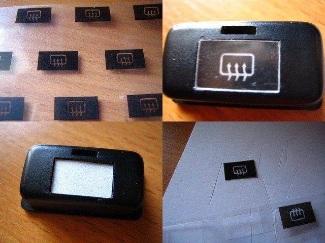 4) Перед тем, как положить последний напечатанный слой, вырезаем рассеивающую подложку по размеру иконки, и уже на неё кладем последний напечатанный слой. Размер подложки сделайте чуть меньше посадочного места, чтобы белые края нигде не выглядывали. Можно опустить подложку и в самый низ, но тогда изображение будет выглядеть утопленным и плохо читаться сбоку. Во вложениях – у иконки обогрева заднего стекла подложка в самом низу, а у иконки задней туманки – предпоследним слоем.