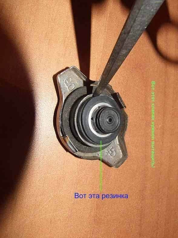 Мужики, а я вот чё подумал. А не может резиночка, которая на клапане (на фото) со временем или от не качественного антифриза, ну или от уже старого, разбухнуть, и тем самым не будет хода клапана, поэтому давление могет и создаётся, а?