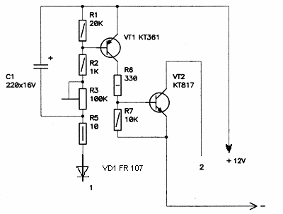 Skif1980, спасибо за удачную идею! Воспроизвел, все замечательно. Внес усовершенствования - сделал плавное выключение света после закрывания двери. За основу взята схема с http://electroavto.narod.ru/salon_svet.html . Применительно к калиновскому плафону - к точке 1 на прилагаемой схеме подключается датчик двери через диод VD1, выход 2 подключается к зеленому проводу плафона. Успехов в творчестве!