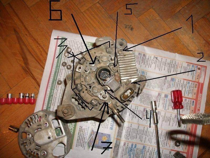 под №6 диоды которые нужно прозвонить? Если я чутка лак зачищу сверху и прозвоню, а после прозвонки покрою ЛАКЦАПОНОМ нормально будет? Снял штуку под №7 и прозвонил между собой все контакты под №3 (на генераторе), между собой в любом порядке они звонятся.
