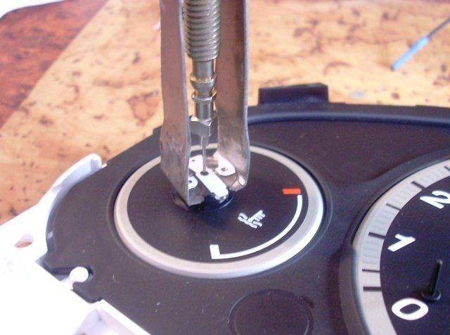 4. Теперь самое трудное, это снятие самих стрелок! Они снимаютси старым русским способом, выдергиванием к такой то матери. НО БУДЬТЕ ОЧЕНЬ ОКУРАТНЫ!!! Выдергивайте придельно окуратно расчитывая свои силы!!!! Стрелки на датчиках уровня топлива и темпиратуры выдергиваются просто, а вот со стрелкой спидометра прейдетси повозиться!!!! Там есть спиралевидный волосок который отвечает за возврат стрелки в исходное положение, НЕ ВЫРВИТЕ ВМЕСТЕ С НИМ, как это сделал я