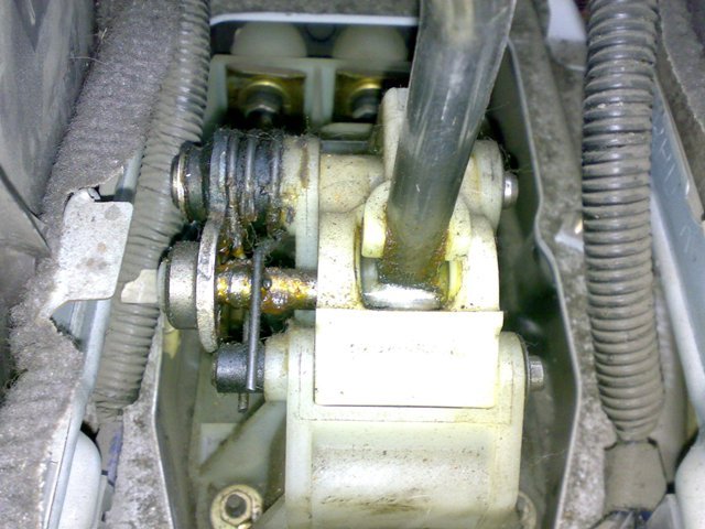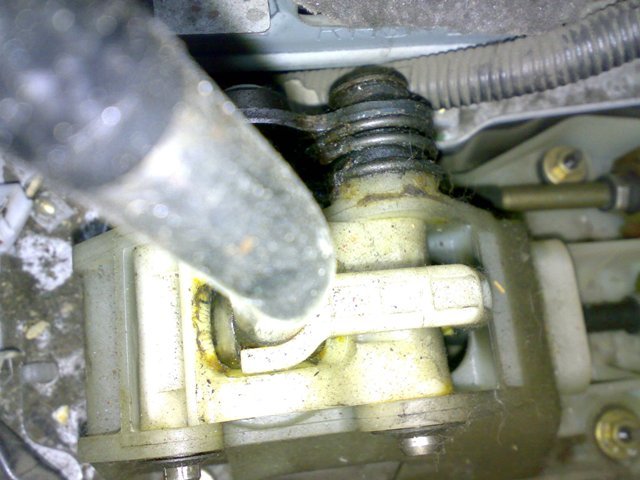 для этого отсоединяем снизу второй тросик (вытаскиваем железую шпильку, снимаем шайбоку и отсоединяем трос от "Г"-образной части) и отсоединяем эту "Г"-образную часть от рычага КПП