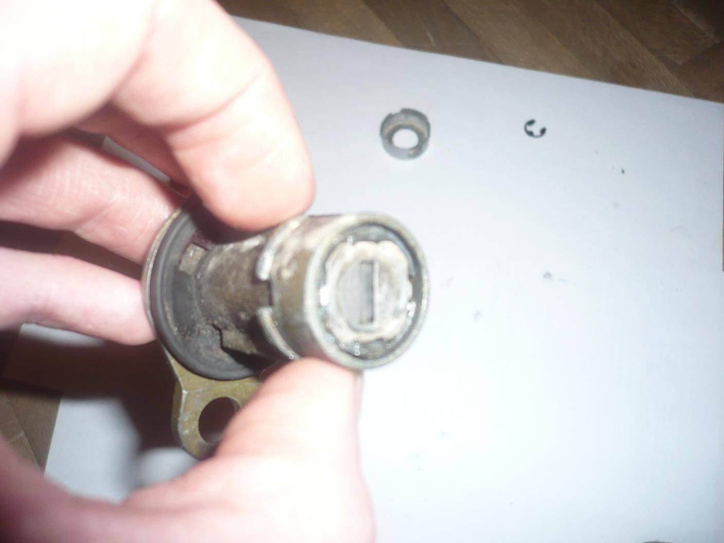 Очищаем пластинки от грязи, проверяем целы ли пружинки и не закисли ли, и убедившись в легкости движений пластинок в корпусе собираем.Вставляем ключ в личинку, а личинку в корпус, ставим стопорное кольцо.Теперь ключ можно вынимать без опасений.Проверяем проворачивается ли личинка в корпусе родным ключем и не проворачивается "чужим" (или отверткой например).