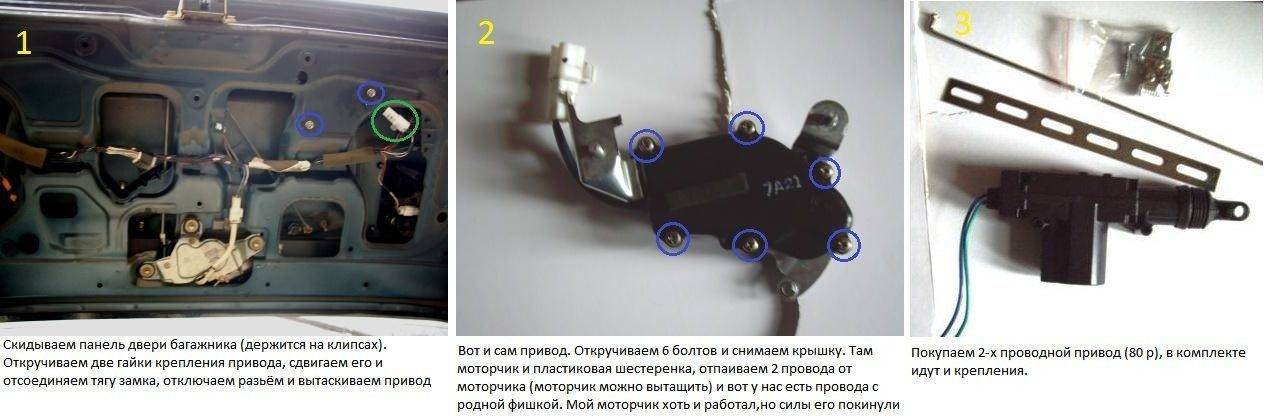 Когда был нормальный замок, багажник открывался просто - нажимая на личинку замка, тянешь дверцу багажника. Т.к. личинку пришлось удалить из-за её поломки, я поставил простой привод на тягу замка как у ToXa, а привод, при подаче напряжения, тянет тягу и отпускает её через долю секунды. Получается, что дверца только приоткрывается, приходится просить кого-нибудь нажать на кнопку на приборке, а сомому тем временем тянуть дверцу на себя))). Вот я и спрашиваю, как на других универсалах открывание устроено - может пружина есть какая, которая дверцу отводит немного от замка при открывании.[/b]