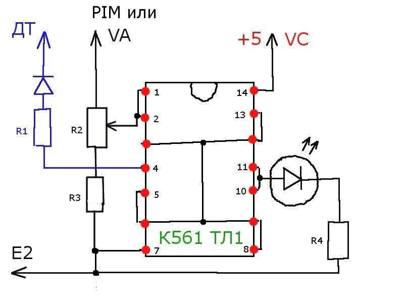 Цитата: Во всех случаях резистор R1 - 2-2.2 kom .Диод - любой. Подключается к Датчику Температуры испарителя. С резисторами R2 & R3 следующая ситуация. Резистор R2 должен быть по номиналу в два- три раза больше чем R3 . R3 может быть любым в интервале от 10 до 100 kom. Мой вариант- R3-10 и R2-22 Возможно, что на дизелях при подключении к датчику насоса или педали (VA) R2 надо будет сделать побольше в 3 -4 раза. Резистор R4 примерно 150-300 ОМ ,а светодиод любой, но лучше не сверхяркий, а самый дешевый.