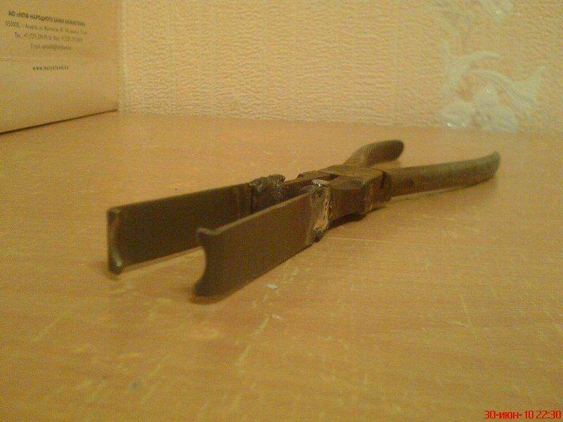 Старые плоскогубцы, привариваем к ним гайку М10, распиливаем ножовкой, обтачиваем на точиле.