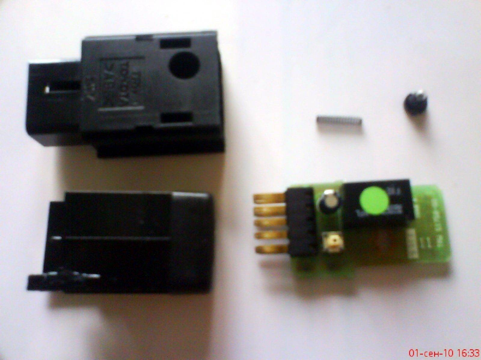 Читайте, уважаемый! Темы объединяю. Kentavr'у укоризна за неиспользование Поиска. Васе Макарову наоборот Плюс Добавлено спустя 6 минут 45 секунд:БелыйГусь писал(а): Копипаст со старого форума БелыйГусь на старом форуме писал(а): Вот и у меня приключилось  Задние туманки зажили своей жизнью. Но благодаря жизненному опыту Андрейки и Веселого Роджера трабл был ликвидирован достаточно быстро. Самое большое время заняла разборка кнопки, вернее боязнь ее поломать  Но ничего не поломалось, там все на защелочках/приливчиках, при помощи часовых отверточек и некоторого опыта кнопка разбирается за полминуты. Получается из кнопки 5 частей - две части корпуса, патрончик с лампочкой, пружинка и плата.  На плате имеем то самое реле о четырех ногах, одна из которых больная  Вот вид больной ноги в трех ракурсах - видна трещина в пайке    При сборке кнопки важно правильно установить пружинку, помогаем направляющей из скрепки.  Вуаля