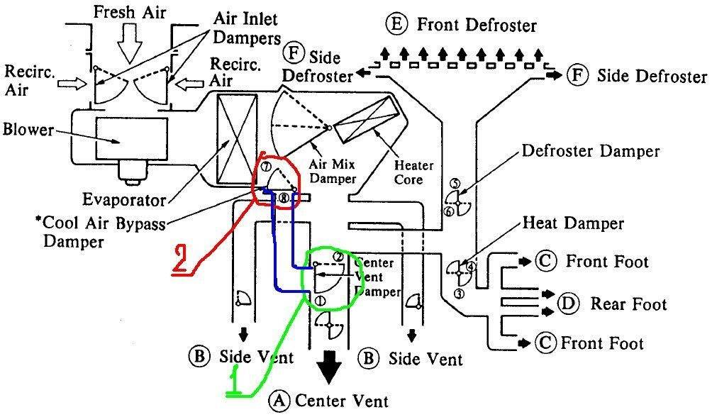 Действительно пытливый и каверзный японский мозг заложил для "морозной свежести" из центральных дефлекторов байпас холодного воздуха, который перекрывается вышеупомянутой заслонкой (1) в положении грудь и ноги/грудь. При фиксировании этой заслонки в положении перекрывающей байпас холодного воздуха существенно меняются потоки воздуха в воздуховодах, по этому снижается поток в боковых дефлекторах.