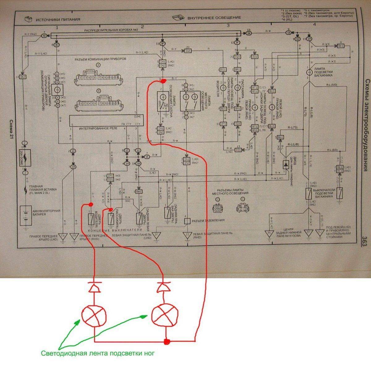 Lifeyar тут немножко не так нужно делать. Диоды которые ты нарисовал не нужны, даже если использовать не светодиодные осветители, а простые лампочки. Точнее сказать они нужны , но в разрыв штатных проводов идущих на концевики. Провода от дополнительных подсветок нужно подцепить прямо к концевикам, а диоды врезать в штатные провода катодами к концевикам