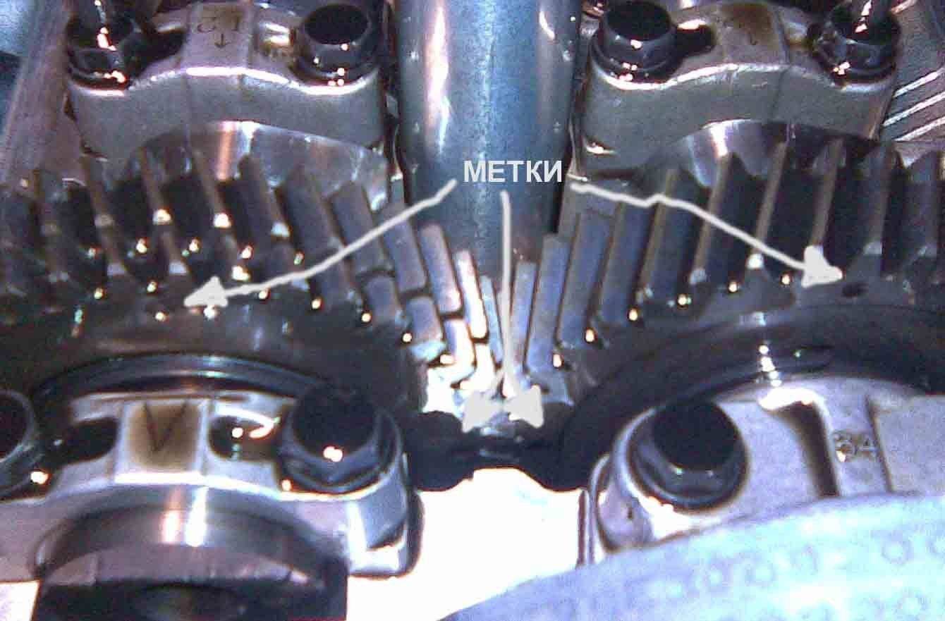 1. Правильность установки валов. Вращая колесо смотришь на валы. На каждом из них есть по две метки под углом 90 град. Так вот, у правильно установленных валов одна метка напротив другой (ровно-ровно, без погрешности +- зуб), другие смотрят вертикально вверх. Если нет - снимать валы, ставить правильно. Если так - двигаемся дальше.