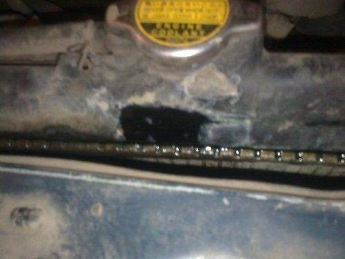 Вобсчем потёк у меня радиатор, ну думаю не может же просто так, смотрю на верхней крышке пластиковой трещина. Видимо, когда то очень давно, когда машину(ой) влупили морду, старый радиатор оставили, гнутый он очень сильно. Вот и не выдержала верхняя крышка, тем более она в месте трещины сильно была деформирована.