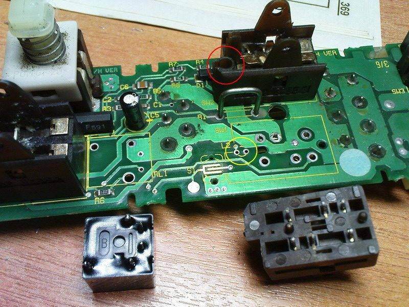 Alexej22ТорпедаСветодиод-то один впаян, но места под остальные, для всех кнопок, на плате предусмотрены. Ниже на фото жёлтыми кругами указаны места "водительского" светодиода (на одной из фотографий, где вид сверху, часть деталей выпаяна для экспериметнтов), а красными - место для впаивания светодиода "переднепассажирского". А "глазки" в кнопках кто-то из клубней делал очень просто: в углублении на кнопке просверливается тонким свёрлышком отверстие, с обратной стороны заливается термоклеем из пистолета до заполнения, потом аккуратно срезаются излишки термоклеевой массы, и в итоге имеем аккуратную матовую точку, через которую в темноте пробивается свет от светодиода.