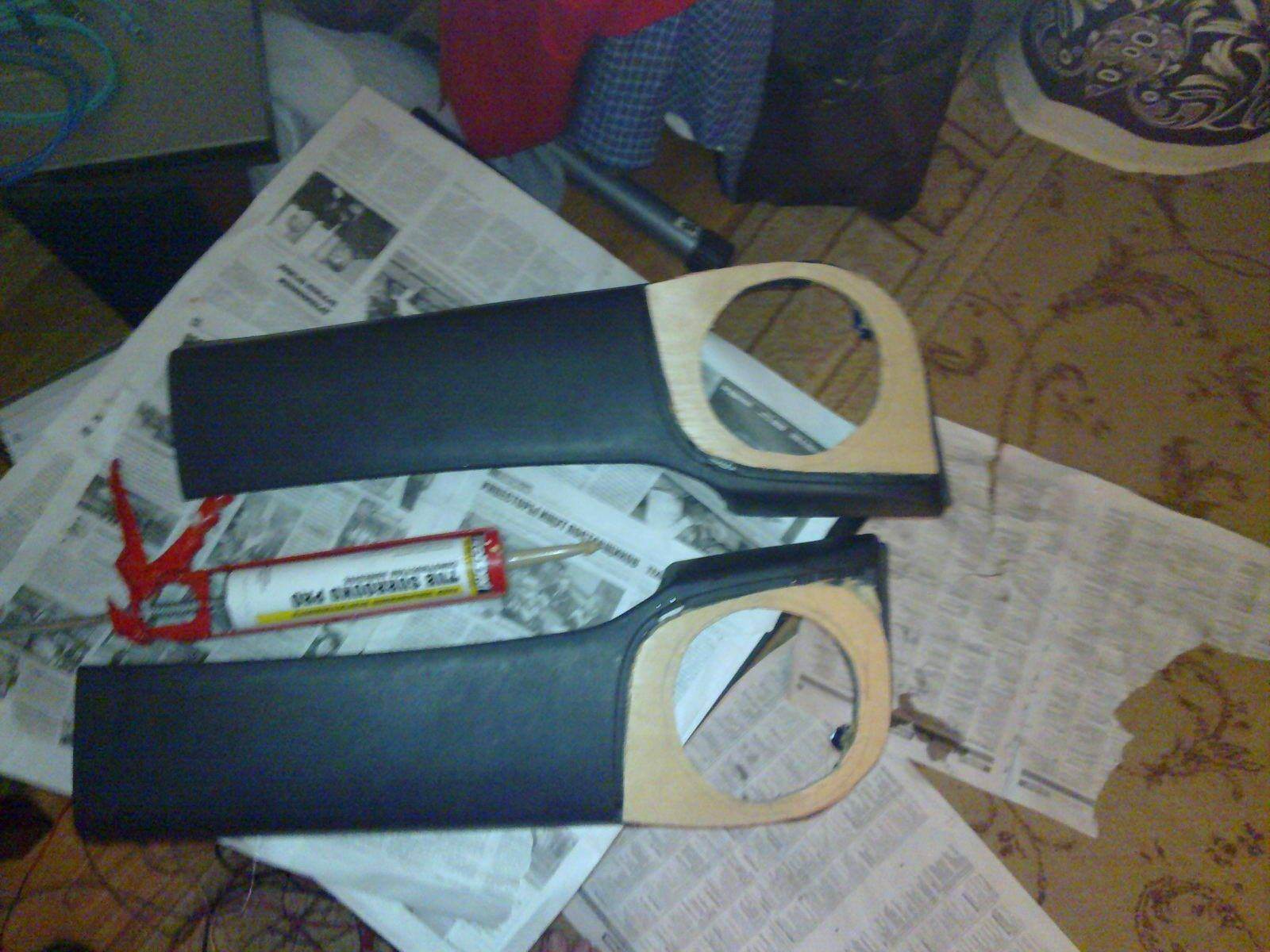 4) Отделяем карман с заводским подиумом от обшивки двери. Делаем отверстие под 16 динамик. В те углубления, в которые вкручиваются саморезы, фиксирующие обшивку на карте инсталируем шпильки регилируя их длинну гайками и шайбами(чтоб сильно внутрь не выступало) Заливаем эти отверстия эпоксидкой и даём полностью высохнуть. После того, как высохло вырезаем трафарет из картона и по нему делаем нижнюю опорную подставку из фанеры, которую фиксируем на кармане саморезами и жидкими гвоздями
