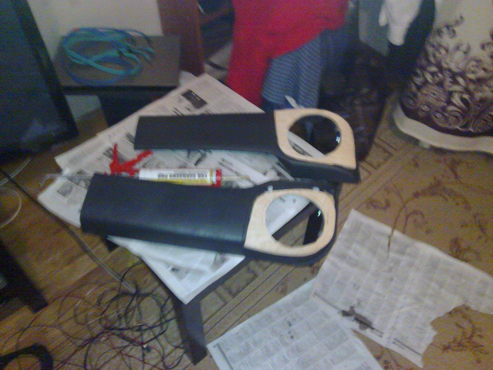 10 ) Обтяжка или покраска - решаете сами. Т.к. не нашёл в городе ни кожзама ни винила, пришлось уничтожить старую кожанку, на которую не поднималась рука выбросить, по причине того, что в ней прошел огонь, водку и 5 лет жизни )))))) Описывать процесс не буду ибо делал "по ходу дела разберёмся". Один подиум получился просто отлично, другой по хуже. Основную поверхность приклеивал на полимерный клей ТИТАН, края прихватывал Суперклеем Момент-Гель. На эту работу можно призвать в помощь женский пол, если конечно вас ещё не выгнали из дома, за предидущие операции :)
