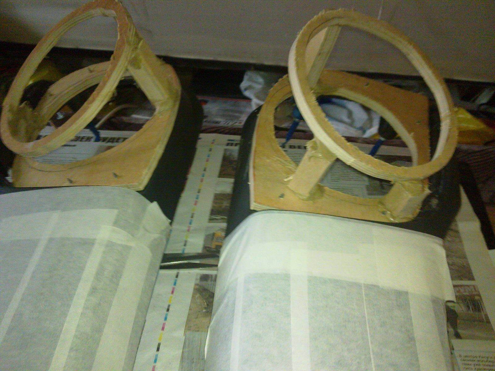 5) Заклеиваем весь карман малярным скотчем, кроме того места, где будет подиум. Делаем верхние проставочные кольца и фиксируем их в нужном положении(я фиксировал жидкими гвоздями), регулируя это положение брусками.