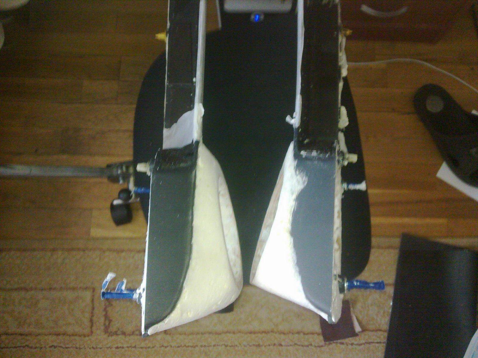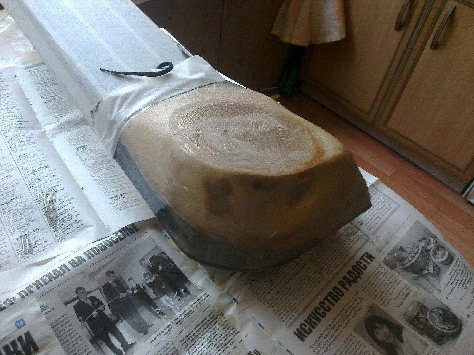 8 ) Похищаем(более интересно :) ) или выманиваем(банально :D ) плотные колготки у любимой и обтягиваем ими нашу заготовку. Поливаем эпоксидкой и втираем её в паверхность(я пользовался шпателем) Спешить и разводить всю эпоксидку - НЕ НАДО! Делайте постепенно и не торопясь. Иначе не успеете и она станет колом, а вы пойдёте в магази за новой порцией. После подсыхания, прорезаем отверстия и наносим эпоксидку внутрь и вообще всюду, куда можно дотянуться, для крепости конструкции и предотвращения контакта пены с окружающей средой. Ждём полного высыхания эпоксидки.