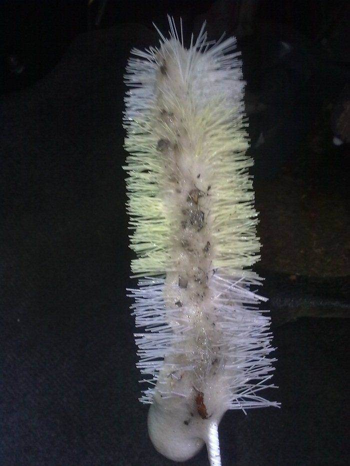 И желательно, пока активно работаете ёршиком, постараться подцеплять грязь снизу блока испарителя - т.к. именно там она в большинстве случаев и скапливается. Также очень рекомендую запастись ведром с чистой водой, и после нескольких движений ёршиком, его ополоснуть в ведре. (опять же на фото всё видно, почему и зачем).
