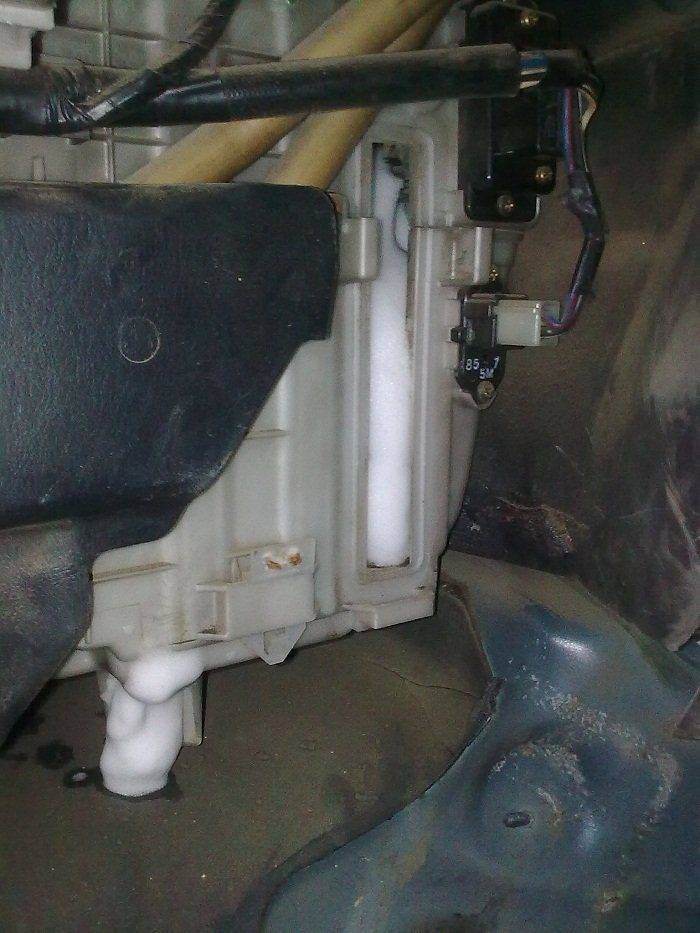 В завершении этого действа, заполняете опять же весь отсек пеной, и теперь ждите, пока пена превратиться в жидкость, и выльется под автомобиль вместе с грязью, через дренажную трубку для отвода конденсата.