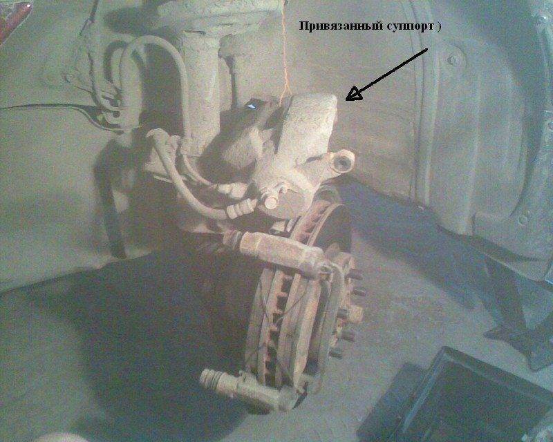 4. После того, как открутил болты, снимаем суппорт и закрепляем его аккуратно (где удобно), что бы не повредить тормозные шланги. Я прикрутил его на всякий случай проволокой, что бы не упал.