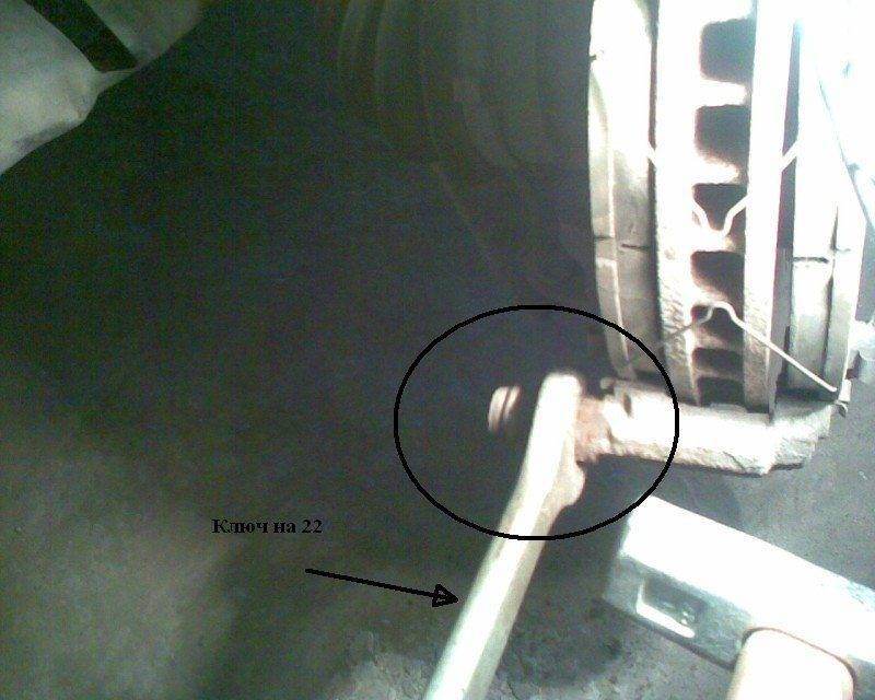 3. Находим болты, фиксирующие суппорт к направляющим. Ключом рожковым на 17 держим направляющую, а головкой на 14 откручиваем болт. Рожковый ключ пришлось стачивать с боков, т.к. он (и все имеющиеся) не входил по ширине.