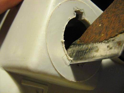 2. потом его вынимете и ровняете отверстие, напильником/наждачным камнем.