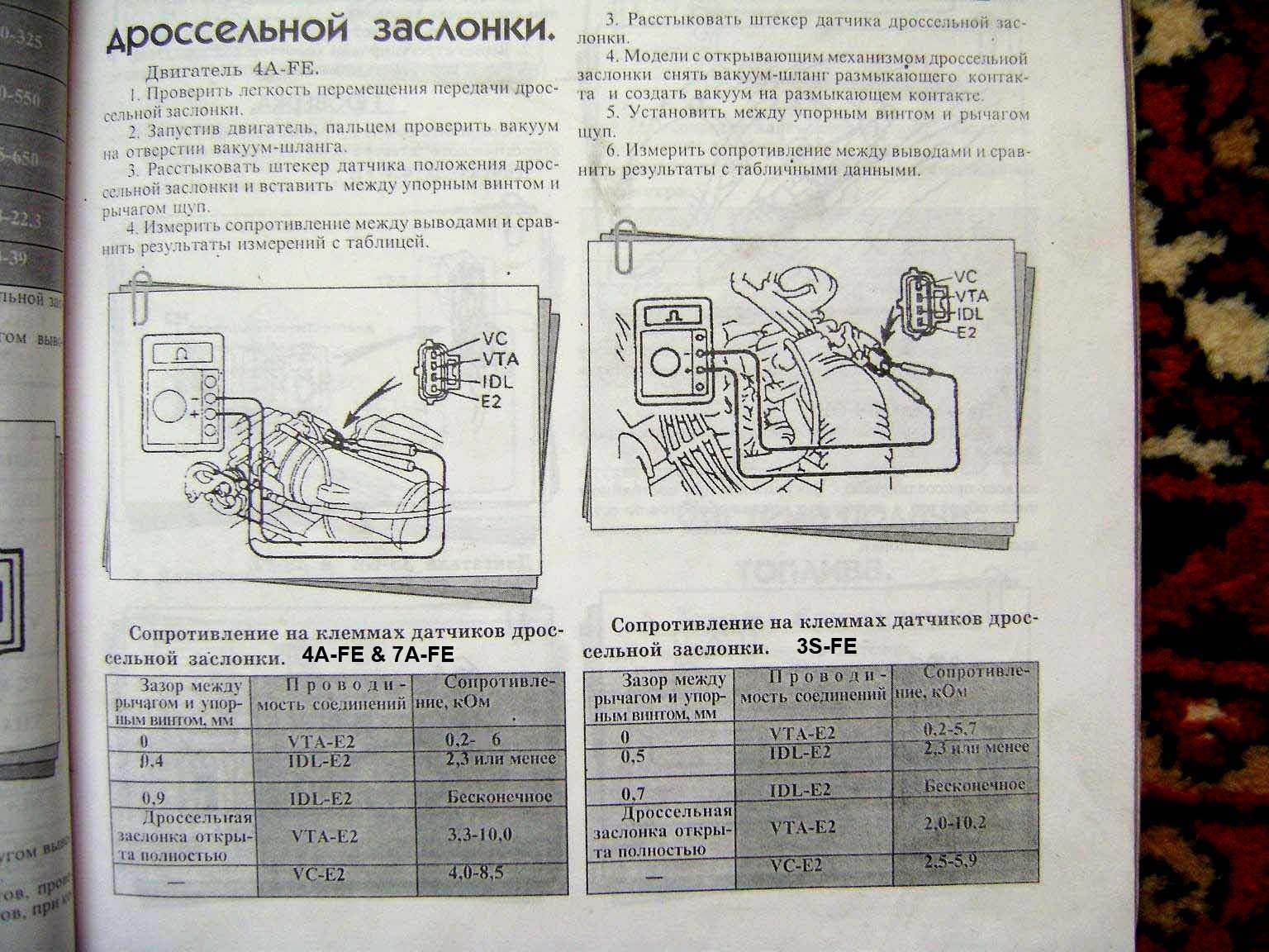 Чуть-чуть ослабляем винты крепления датчика, вставляем щуп 0,7 (для 3S-FE) цепляемся мулитиметром к IDL - E2 и чуть чуть постукивая маленьким молоточком буквально по милиметрику ловим момент когда проводимость пропадет (мультиметр покажет бесконечное сопротивление). Фиксируем верхний болт и проверяем уже по всем контактам по мануалу, фиксируем нижний болт - еще раз проверяем ВСЕ со всеми щупами. Обнуляемся и обучаемся =)