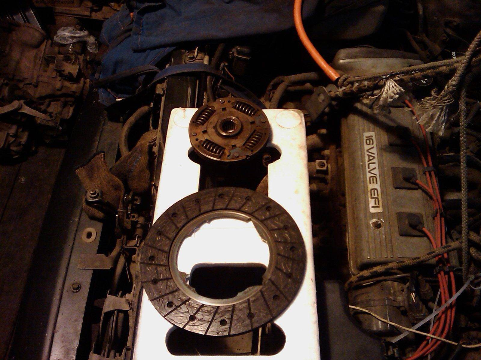 Всем доброго времени суток. итак, как обещал отписываюсь. МКПП С52. Поломка оказалась в диске сцепления, а точнее поломан оказался диск сцепления (см.фото) Машина не наша, у знакомого. Замену проводили самостоятельно в гараже с ямой. Фотоотчеты по замене сцепления присутствуют, но и от себя скажу не та это процедура не самая простая, но вполне осуществима. Коробку снимали/ставили на не снятый мотор в первые. Глаза боятся руки делают Итак. 1. Снимаем коробку - снимаем АКБ, корпус воздушного фильтра - отцепляем ДЗП (датчик задней передачи) и ДС (датчик скорости), так же откручиваем массу и рабочий цилиндр сцепления с магистралью - отцепляем тросики от кулисы - откручиваем ступисчные гайки гайки залазим под машину - снимаем локера с левой стороны - ослабляем нижнюю шаровую (тут мы открутили только левую шаровую, причем скрутили болт и две гайки от рычага, а не от самой ступицы)) - поддомкрачиваем левую сторону и ставим ее на "пенек" - снимаем левый привод, без внутренней гранаты. (Мы просто не стали рисковать и не стали выбивать, но думаю слив масло и вынув привод вместе с внутренней гранатой будет удобнее. - с правого привода снимаем хомут внутренней гранаты и сдергиваем пыльник, в данном случае была проволочка которая в последствии была заменена на полноценный хомут. - откручиваем болт передней подушки, и снимаем продольную балку вместе с подушкой - снимаем стартер. (если старте снимать до снятия продольной балки то это менее удобно. Понял это уже при установке стартера. - сняли капот и подвязали двигатель к "кран балке" чтоб не упал двигатель - снимаем левую опору двигателя вместе с кронштейном! - снимаем заднюю подушку - нам показалось что будет проще если снять и кронштейн к задней подушке который крепится к коробке. Было два варианта либо вынимать подушку, либо снимать кронштейн. Визуально оценив ситуацию, было решено снимать кронштейн потому как подуху не вынуть пока его не снять - откручиваем болты крепления коробки к блоку. - проверяем что от коробки все откручено и ни чего не соединяет ее с двигателем - сдергиваем коробку в левую сторону. Обращаем внимание что правая внутренняя граната имеет свойство зацепляться за защитный металлический щит который между коробкой и блоком находится. Поворачивая привод немного можно упростить сдергивание коробки. Но у нас это кровушки попило. Несколько раз в голове промелькнула мысль о том что проще было слить масло и сдернуть вместе с гранатами привода. Коробка снята под машину. перекур сунув палец в корзину и побренчав диском сцепления было удовлетворение от проделанной работы ибо не зря! Заняло сие мероприятие около 4 часов. Установили диск сцепления (5а-fe) и корзина (4а-ge) контрактные. Стоявшая корзина уже перегрета оказалась в следствии чего деформирована Для центровки диска был куплен вазовский выравниватель диска. Не скажу что идеально но подошло. От ГАЗа уже не подошел, диаметр больше. Воспользовавшись случаем были заменены картриджи в задней и передней опоре двигателя. Установка МКПП - ставим подушку заднюю на место, но не фиксируем, вдруг что. - самое важное в этом это отцентрированность диска, если отцентрировано идеально, то мучения будут не зря. - Сразу скажу что нам пришлось снять правый привод, потому как проще его снять и потом установить чем пытаться попасть им в гранату. Так же сняли кронш