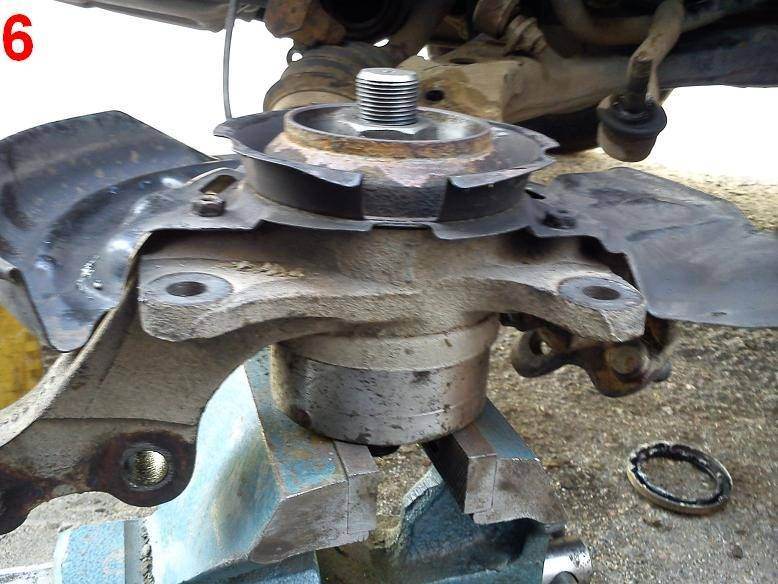 Отчета по переднему не нашёл на форуме, так что вот. Так уж совпало что подшипник загудел со сменой резины. Шипы как известно гудят по асфальту.. Вот и у меня загудели  Да так что комфортно ездить было сложно. Музыка не помогала.. А тут я как раз начал шумить машину, а процесс это бесконечный (кто делал тот поймёт)  Так что первым делом в качестве борьбы с диким гулом были зашумлены арки!  И ведь, блин, помогло!!  Гул приглушился. В общей сложности проехал около 2000 +/- 500км Стоял NACHI. Даже и не знаю родной или меняный. Какой у них ресурс? Вот видео перед ремонтом http://www.youtube.com/watch?v=I56vcZ2w_mw Итак куплен NACHI 38BVV0726G и сальники Musashi T1220  Значит, едем в гараж, топим печку..кипяточку можно попить напоследок! Снимаем литьё и вытаскиваем шплинт  Теперь зажимаем тормоз и головкой на 30 откручиваем ступичную гайку  И это нихрена не просто! Поэтому пришлось ставить запаску, опускать машину на колесо для дополнительного сопротивления, делать рычаг и прыгать на нём всем городком  Ну, допустим победили! Дальше нужно снять суппорт и его вилку. Фотать не стал, есть отчет от Woolf http://www.carina-e.ru/viewtopic.php?p=336253 А сам суппорт подвязать веревочкой за пружину! Это важно! Открутить шаровую от рычага. Я думаю все согласятся что открутить о рычага попроще чем снимать конус с кулака. Как и где открутить можно посмотреть тут Отчет от Vitek Ему и респект. Ну, наконечник я зафотал  Он оказался уже дохловатым и просящимся на замену.. Но под рукой не оказалось  Шплинт высверливал, а снимал вот таким вот пауком:   Далее нужно открутить два болта крепления стойки к кулаку. Фоток опять нету, но с другой стороны, это два последних болта на который всё это дело висит. Теперь нужно снять ступицу со шлицов вала. Применяем подходящий съемник. Я использовал большого паука. Им же потом и перепрессовывал. Принцип такой  Вот она, чудо штука!!  Дальше фоток совсем мало.. Тк я погрузился в процесс и сложил в него кучу уев и нервов тоже немало. Прежде чем начинать замену подшипника, прикупите нормальный съёмник Иначе парой часиков дело не ограничится! Я убил около 10 часов!!! Этот паук постоянно перекашивало. Центр поймать очень сложно.. В итоге я почти все делал кувалдой! Без энтузиазма конечно!  Оправки тоже делал на месте из всякого хлама. Замучился в общем! Ну ладно, допустим есть всё что нужно! Первым делом выпрессовываем/выбиваем ступицу. Для этого зажимаем кулак ступицей вниз и давим/куячим на ступицу (самый маленький видимый диаметр) Примерно так:  На ступице останется одна из внутренних обойм старого подшипника. снимается так: Вот опять фотки нет, а жаль! Теперь нужно выбить внешнюю обойму из кулака. Для этого снимаем сальник и вынимаем стопорное кольцо. Оно удерживает подшипник. Снимается плоскогубцами с длинными тонкими губами. После переворачиваем кулак внешней стороной вверх (той стороной откуда вылетела ступица  ) И опять куячим по самому маленькому диаметру через подходящую оправку. Я юзал кусок трубы. Бить со всей дури не нужно. Все выбивается без особых усилий. Главное равномерно постукивать. Да и вообще с кувалдой сложно спорить Новый подшипник разваливается в руках! Поэтому я его стянул шайбочками  Ну и все запихиваем всё обратно. Теперь намного легче, потому что есть старая внешняя обойма!! Не выкидывать ни в коем случае!!! Она сильно упрощает установку! Посадочные места вымываются, если надо шкурятся. А д