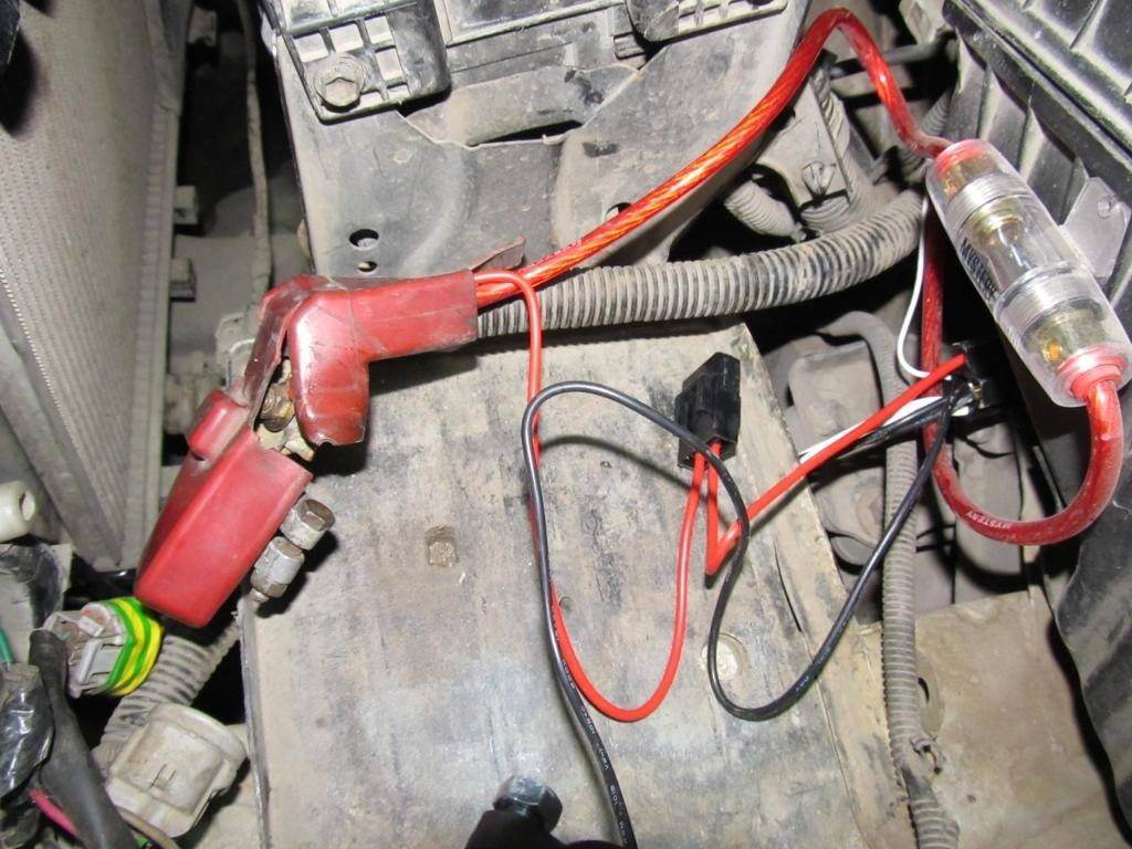 Цепляем + к клемме аккумулятора, - можно к кузову, можно ко 2-й клемме. закрепляем реле (у меня на воздушном фильтре сбоку) (более толстый красный провод от Усилителя) Вложение: