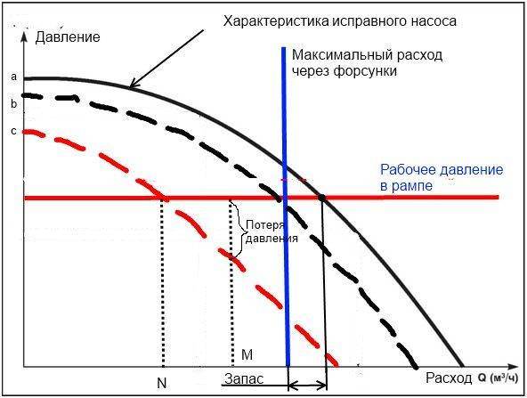 Попытался изобразить это дело на графике, нарисовал как мог, тапками кидаться только новыми и парными. Черной сплошной линией - характеристика исправного насоса. Красная горизонтальная линия - давление срабатывания регулятора на рампе (условно примем это давление постоянным, исключив корректировку в зависимости от разрежения в коллекторе) Синяя вертикаль - расход бензина через чистые форсунки при максимально возможном времени их открытия, задаваемом ЭБУ. Исправный насос при рабочем давлении гарантированно должен иметь запас по производительности (на горизонтальной оси отмечен), который и сливается в обратку. Наличие бензина в обратке при исправном регуляторе и чистых форсунках говорит об исправности насоса. Насос изнашивается, и его характеристика со временем уходит от идеальной - пунктирные графики. Черный пунктир - насос на пределе, запаса производительности при рабочем давлении нет, в режиме максимальной мощности в обратке бензина уже нет, но потребности двигателя насос еще обеспечивает. И краснопунктирный график - дохлый насос. Его производительности хватает только до расхода величиной N, при меньших нагрузках (расходе) он со своей задачей справляется и даже что-то продавливает в обратку. Стоит приоткрыть форсунки на большее время , расход возрастает (точка M), в обратку уже ничего не течет, давление упало (отмечено фигурной скобкой) Вот поэтому и Dmitry_R писал(а): Если измерять давление с тройником на рейке, то на ходу, а манометр под дворник. Водила выжимает из машины все, а помощник - фиксирует давление на разных режимах.