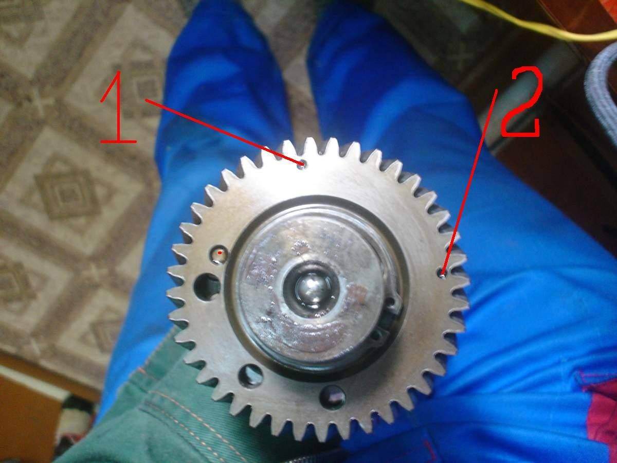камильПри одном обороте коленвала распредвал на сколько проворачивается?Фотка под углом,а смотреть надо сквозь отверстие на распредшестерне.Пусть попробует,на зуб переставит,посмотрим как метки сойдутся