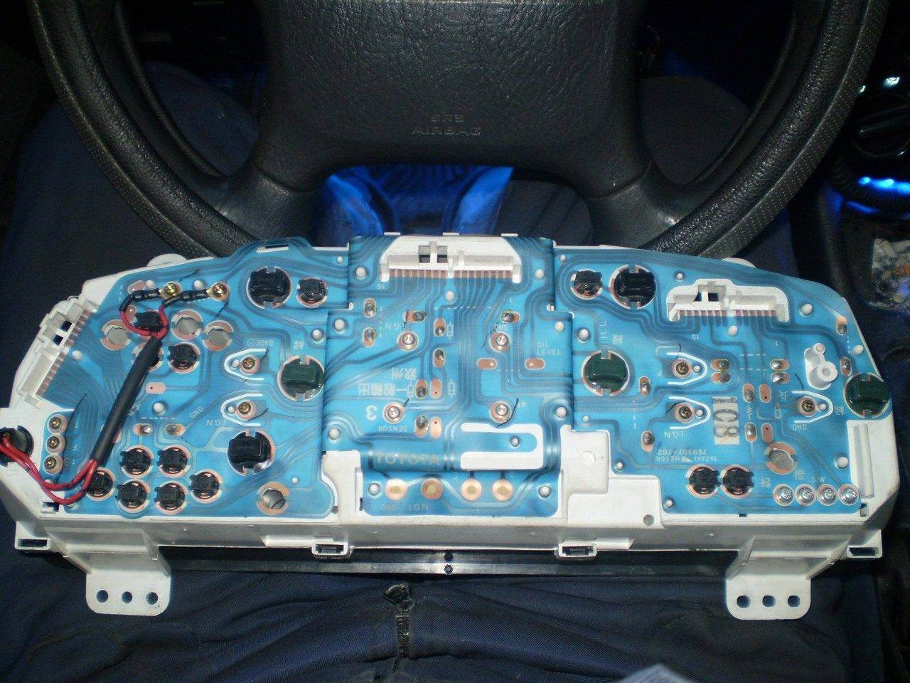 Господа, давайте действительно поддержим просьбу о фотках приборок и распиновках от Novi40k  Ведь снять приборку не составляет великих усилий, 20 минут вашего времени и в ответ наша благодарность и ещё нескольких людей страждующих сей затеей!!!!!!Ну, а тому кто выложит приборку Т20 1997г. с распиновкой, ставлю бутылку ВИСКАРЯ!!! В принципе мы с ним добились кое каких результатов: Поворотники мигают Аварийка тоже мыргает Чек загорается и гаснет как положено Масло так же как чек Спидометер работает Подсветка горит Дальный мыргает Сено показывает (бензин) Антифриз тоже норм. Откр. дверей горит Ручник светится))) Эконометр- чёт перепутали, загорается янарным и гаснет при запуске как чек Зарядка - не горит чёт пока, видать в эконометр воткнули))) Низкий уровень тормозухи тоже не фурычит Вот пока в принципе и всё за 3 вечера колупания!!! Самое поганое что: В VDO цвета проводов идут не те что на японке! Но по каким то необъяснимым причинам у нас получается на 2 провода больше чем на фотках у ПЁТР в теме viewtopic.php?f=4&t=1683 У него вроде 31 хвостик, а у нас 33?????????? В субботу выложу свою распиновку приборки Т18 !!!!