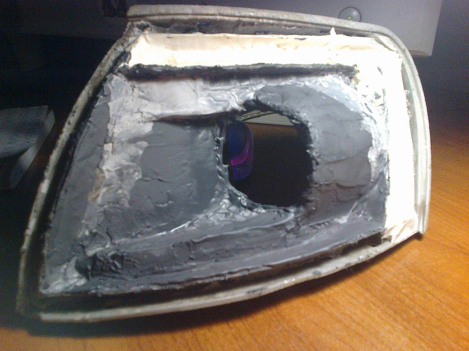 Шпатлевание (3 слой) маски. Процесс изготовления одной туманки-поворотника близится к завершению.