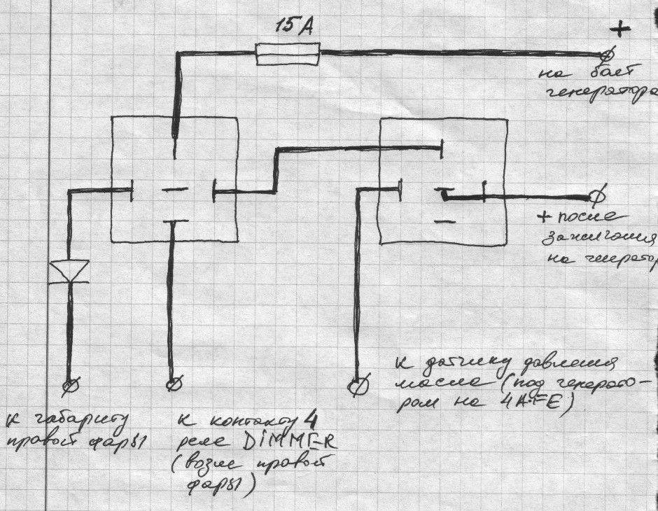 Makwein писал(а): Сделал себе постоянный ближний на двух реле и одном диоде.  Установил возле правой фары. Алгоритм действия: запускаешь двигатель - включается ближний, включаешь габариты или свет - система переходит в стандартный режим. Чтобы отключить данную функцию нужно просто вынуть дополнительный предохранитель.  А схему можно увидеть?
