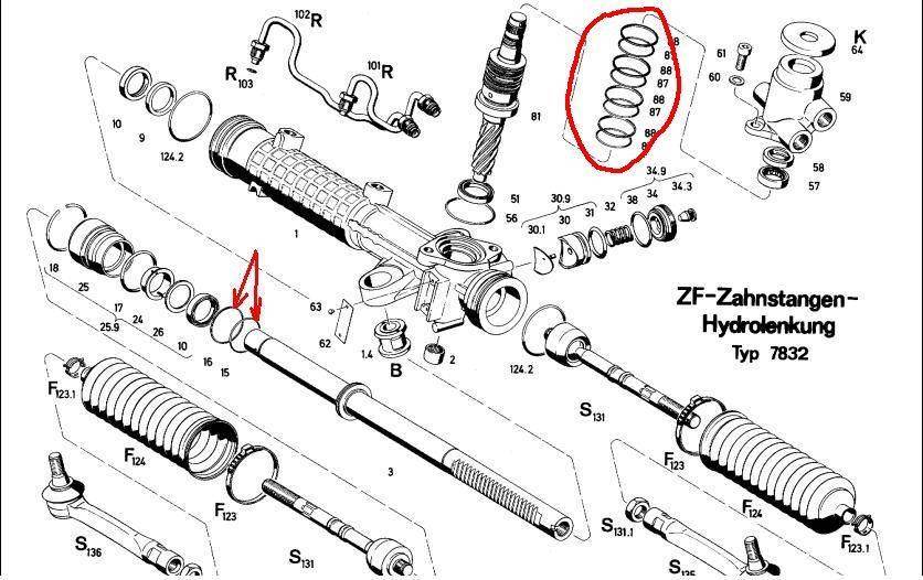 wAnTed, на кариновских ZF-рейках под каждым тефлоновым кольцом лежит резиновое, которое поджимает тефлоновое. Очень грамотное решение. Это на схеме и зарисовано - восемь колец в корпусе управляющего клапана (4 резиновых и 4 тефлоновых) и два кольца в сепараторе рабочего гидроцилиндра (одно резиновое, одно тефлоновое).