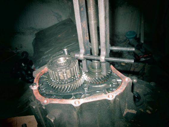 В общем,почитав инфу о грамотной переборке кпп,пришел к однозначному мнению,что разбирать нужно начиная с пятой передачи и далее по порядку,т.к. натяг подшипников диффа регулируется без валов,т.е. дифф в корпусе кпп,без всего остального,в связи с чем начались нудные поиски нужных сьемников,в итоге один был куплен в магазине за 450р,второй мне изготовил токарь по моим размерам за 200р. Итак,приступим.Сразу оговорюсь,что болты колокола коробки я уже открутил,и более того,вытащил через попу дифф,что оказалось к лучшему,т.к. в итоге он служил мне образцом при подборе инструмента,так что диффа в коробке вы не увидите Сразу отвинтим три болта головкой на12 со стороны картера сцепления,чтоб потом коробку не вертеть)) Отвинчиваем болты крепления крышки шестерен пятой передачи,назову так,да простят меня многие))и видим это: Головкой на 10 откручиваем болт крепления вилки 5й передачи,на фото помечен красным кругом в левом верхнем углу,(болт посажен на анаэробный герметик),и снимаем стопорные кольца с муфты 5 передачи и вала,на фото отмечено синим.Снимаем муфту и вилку одновременно. Бородком развальцовываем и головкой на 27 откручиваем гайку,заряжаем сьемник и стягиваем шестерню После чего получается вот так Далее берем самопальный сьемник и снимаем ступицу синхронизатора,снимаем шестерню пятой передачи вместе с кольцом синхронизатора,не забываем про игольчатые подшипники внутри) После чего откручиваем пять болтов крепления пластины,тоже на клею,кстати,и не забываем снять с вилки стопор,на фото помечен желтым кругом Видим такую картину и снимаем стопорные кольца с подшипников валов,отмечены желтыми стрелками,откручиваем шестигранником пробки,внутри подпружиненные шарики,не теряем,откручиваем всеболты головкой на 12 по периметру корпуса и,постукивая по отливам на корпусе(без фанатизма)снимаем корпус,получается вот так,только с диффом) Ну и все,вынимаем одновременно все валы и начинаем все чистить и мыть(( Конечно,на других форумах есть подробнее отчеты,но своего у нас вроде не нашел,а также извиняюсь заранее за возможно непонятное изложение всего происходящего.