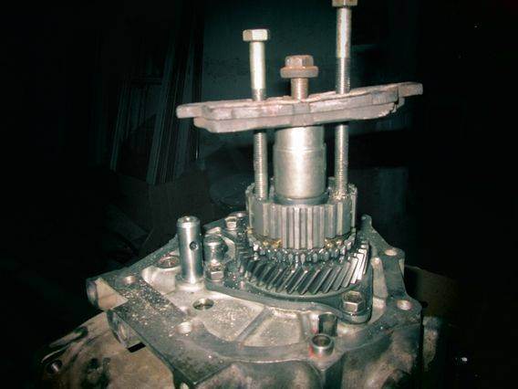 В общем,почитав инфу о грамотной переборке кпп,пришел к однозначному мнению,что разбирать нужно начиная с пятой передачи и далее по порядку,т.к. натяг подшипников диффа регулируется без валов,т.е. дифф в корпусе кпп,без всего остального,в связи с чем начались нудные поиски нужных сьемников,в итоге один был куплен в магазине за 450р,второй мне изготовил токарь по моим размерам за 200р. Итак,приступим.Сразу оговорюсь,что болты колокола коробки я уже открутил,и более того,вытащил через попу дифф,что оказалось к лучшему,т.к. в итоге он служил мне образцом при подборе инструмента,так что диффа в коробке вы не увидите Сразу отвинтим три болта головкой на12 со стороны картера сцепления,чтоб потом коробку не вертеть)) Отвинчиваем болты крепления крышки шестерен пятой передачи,назову так,да простят меня многие))и видим это: Головкой на 10 откручиваем болт крепления вилки 5й передачи,на фото помечен красным кругом в левом верхнем углу,(болт посажен на анаэробный герметик),и снимаем стопорные кольца с муфты 5 передачи и вала,на фото отмечено синим.Снимаем муфту и вилку одновременно. Бородком развальцовываем и головкой на 27 откручиваем гайку,заряжаем сьемник и стягиваем шестерню После чего получается вот так Далее берем самопальный сьемник и снимаем ступицу синхронизатора,снимаем шестерню пятой передачи вместе с кольцом синхронизатора,не забываем про игольчатые подшипники внутри) После чего откручиваем пять болтов крепления пластины,тоже на клею,кстати,и не забываем снять с вилки стопор,на фото помечен желтым кругом Видим такую картину и снимаем стопорные кольца с подшипников валов,отмечены желтыми стрелками,откручиваем шестигранником пробки,внутри подпружиненные шарики,не теряем,откручиваем всеболты головкой на 12 по периметру корпуса и,постукивая по отливам на корпусе(без фанатизма)снимаем корпус,получается вот так,только с диффом) Ну и все,вынимаем одновременно все валы и начинаем все чистить и мыть(( Конечно,на других форумах есть подробнее отчеты,но своего у нас вроде не нашел,а также извиняюсь заранее за возможно непонятное изложение всего происходящего.