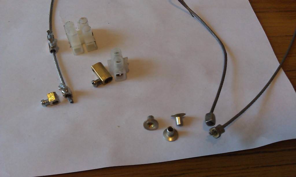 Я использовал вариант с гайками от велосипедных спиц в качестве заделки. Шляпку гайки можно отпилить. Остальное - (трубочка с резьбой) обжимается на тросе. Желательно не просто расплющить молотком, а положить эту трубочку (с вставленным тросом) в канавку и ударить сверху - чтобы сжатие было хотя-бы с 3-х сторон. Да, очень важно перед завальцовкой не забыть надеть на трос всю гирлянду (из пружины, оболочки и что еще было до разборки). Трос желательно брать нержавеющий 1,5мм...1,7мм. Без пластиковой обертки. При ремонте желательно также поменять оболочки тросов (боудены), поскольку они проржавевают и трос начинает клинить в них, замедляя перемещение стекла. Также желательно поменять ржавые пружины. Думаю, что длины тросов надо подбирать так, чтобы пружины были сжаты где-то на 75 %. Их смысл - эффект демпфера. Если сжать пружины полностью - трос будет перетянут и вскоре порвется. Если прослабить - оболочка с тросом будет выскакивать из упорных гнезд. Желаю всем удачи в ремонте!!!