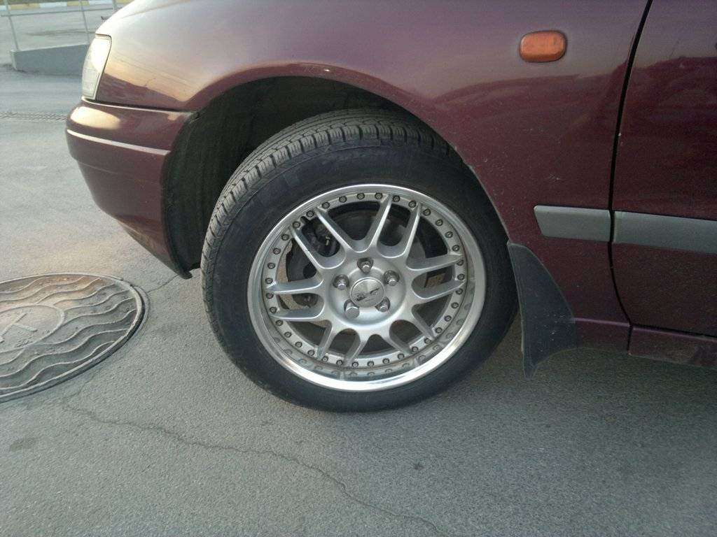 Диски sakura wheels,шли с красной полосой,ее пришлось заклеить полосой пленки матовой белой,параметры дисков 16,вылет 40,ширина 7,резина тойо 55 на 195,пришлось подрезать кромку задней арки мм на 5.