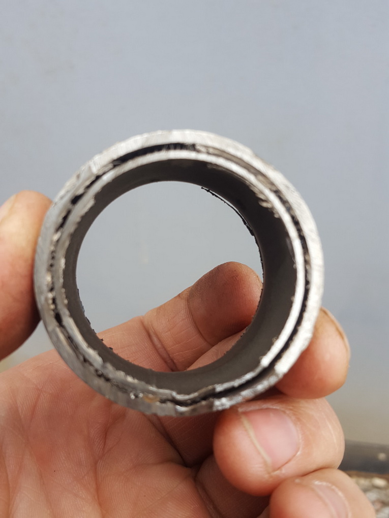 ну вот и до катался! Ехал я тут как то ну по очень плохой дороге! Кочка на кочке, ямка на ямке, колдоебина на колдоебине! И вдруг рев как от реактивного самолета! Ищу более менее ровный участок без глубоких луж. Заглядываю вниз и нате вам здрасьте! Рев от меня. Далее еду ну очень аккуратно до ближайшего асфальта. Домкрачу, нахожу в багажнике запасную проволочку. Приматываю. А далее как на прямотоке! Люди пугались. Приехал домой и начал обзвон. Нашел неподалеку мастера. Договорился переварить оба соединения. Фланцы были куплены заранее. Три часа работы и снова тишина в салоне. Чел работает в Ясенево, варит аргоном разные выхлопы. Сам их создает. Если надо. пишите дам телефон. Во время работы обнаружилось что на родном глушителе сделана труба в трубе! Это зачем же они так японцы делают?