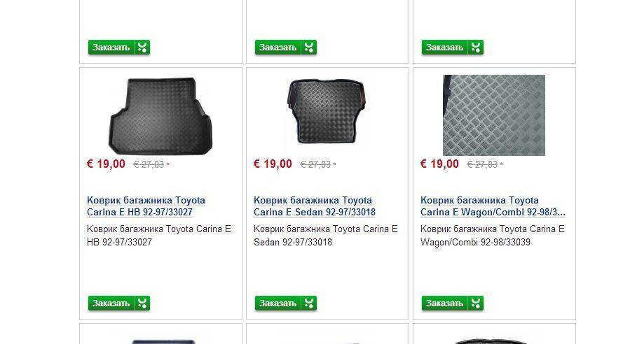 я в своё время в сети магазинов AGA купил коврики резиновые в Карину. Что-то около 1000 руб отдал, не больше. Высота борта была сантиметра 2 точно. Очень удобно, даже если зимой забыл положить газетку в коврик, вода вся в ковриках остаётся. Очень актуально на зимней рыбалке. А то народ кто отбивает снег с ботинок (валенок или сапог), а кто нет. Пока доедешь до Москвы снег превращается в воду. Ща в Королле коврики стоят тоже хорошие (от прошлого хозяина), но у них бортик чуть ниже. ein6tein писал(а): Надо будет ещё в багажник заказать я всё хотел в Карину поставить, но так и не купил ))). В Короллу то почти сразу купил. Кстати, тоже в AGA брал, ценник что-то менее 1000 руб. Борта высокие, 1,5-2 см, да и покрытие не скользящее, что тоже приятно. ЗЫ наверняка в Белорусии есть AGA. Контора то солидная, я её знаю уже лет 15 наверное. http://www.agah.ru/component/option,com ... BAxaGR1TfI