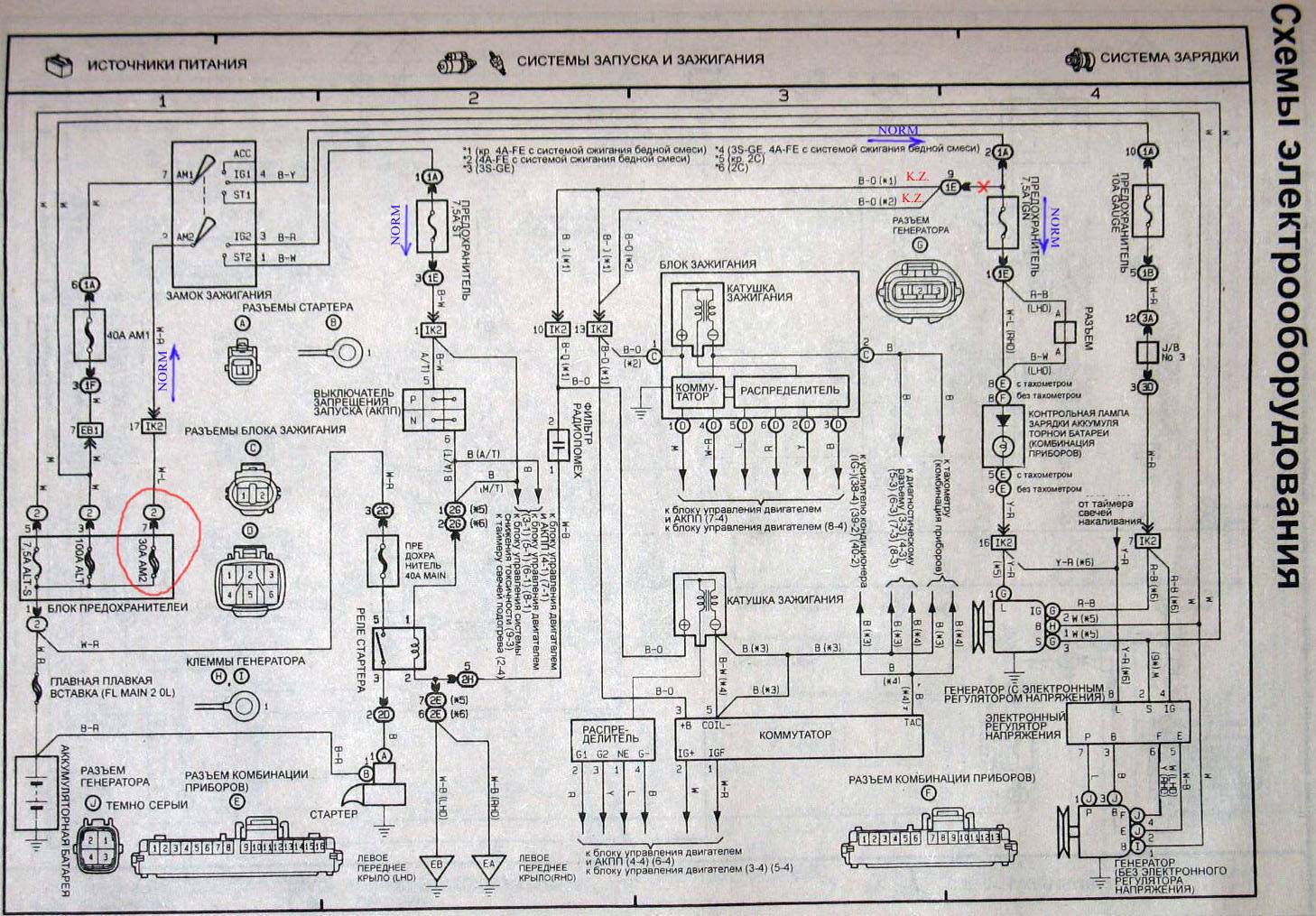 Всем привет, сгорел предохранитель 30А АМ2 ( на схеме обведен кружочком), заменяю на новый- при включении зажигания он сгорает тут-же, половина машины -обесточено. Начал прозванивать цепи до и после замка зажигания на предмет К.З. , разъединил толстый провод B-R (черный с красной полосой, на схеме место разъединения обозначено крестиком). Вставил опять предохранитель, включил зажигание , предохранитель жив. на данный момент в машине работает все кроме : 1. эл. магнитный клапан отсечки топлива 2. Таймер свечей накаливания и свечи с ним. 3. не загорается соответственно лампа свечей накала. 4. ну и МОЗГ (блок управления ЕГР и турбонадувом) отключен. Схема по номером 3 немного от бензинки, но стартер и гена у меня соединены так-же, главное что стартер с ключа крутит и зарядка то-же есть. Вопрос: где в машине искать этот разъем обозначенный на схемах как 1Е , контакт под номером 9 -? какова вообще методика дальнейшего поиска короткого замыкания в авто-? потому как этот толстый провод B-R (черный с красной полосой) уходит в жгут и под торпеду, отследить его путь визуально просто невозможно.