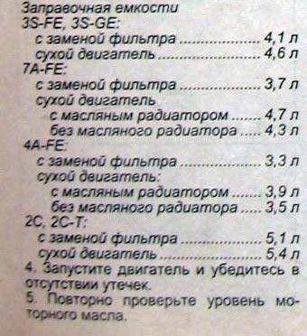 4.В мой двигатель (7A 1,8 л) ушло ровно 4,0 л (в 3.2009 залил ELF COMPETITION STI 10W-40).