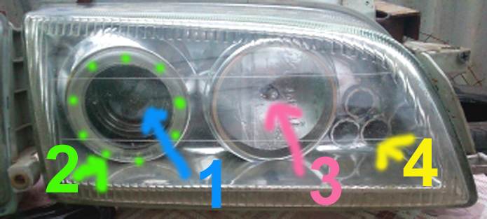 В 1 и 3 обычные h1 лампочки. В 4 и 2 стоят старомодные диоды работают как габариты, в 2 они снизу 2 штуки, колечко светится тускло Корректора нет, регулировка болтами Крепление норм, прижимаются плотно