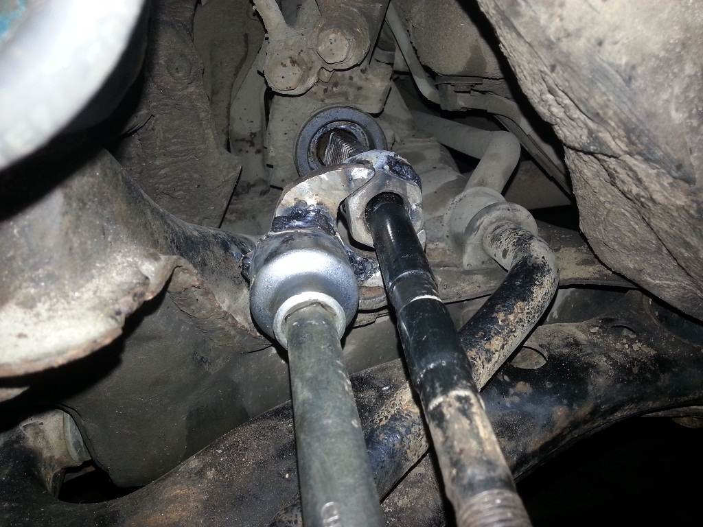 менял тягу думал в ней люфт и она постукивает, на тяге были слизаны грани, ключ не захватывал, разводным не подлезть особо туда, на тягу надел гайку на 32 и прихватил, обрезал ключ на 32 и приварил головку, только так удалось победить. обидное что стучала не тяга(( шаровая новая, стойки стаба полиуретан, рычаги перебраны, походу в рейке люфт есть (((